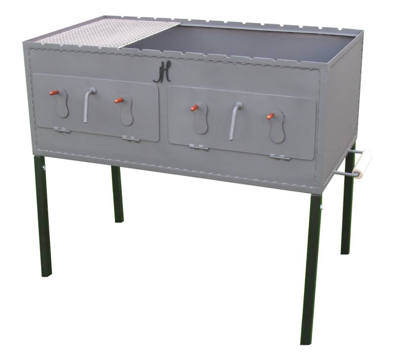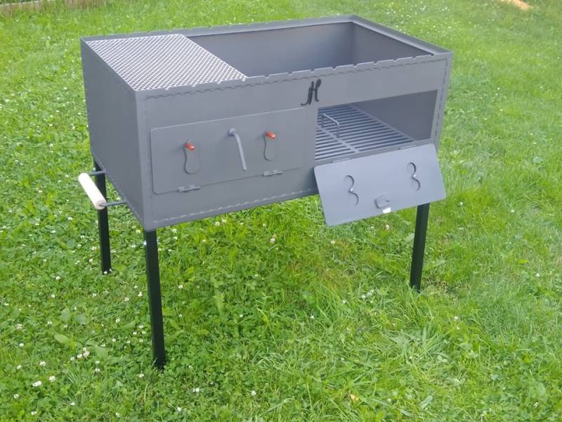 Gril na makrely je vyroben z kvalitní černé oceli a je opatřen odnímatelnými nožičkami pro snadnější manipulaci i uskladnění. Je určen pro grilování na dřevěném uhlí nebo na dřevě.